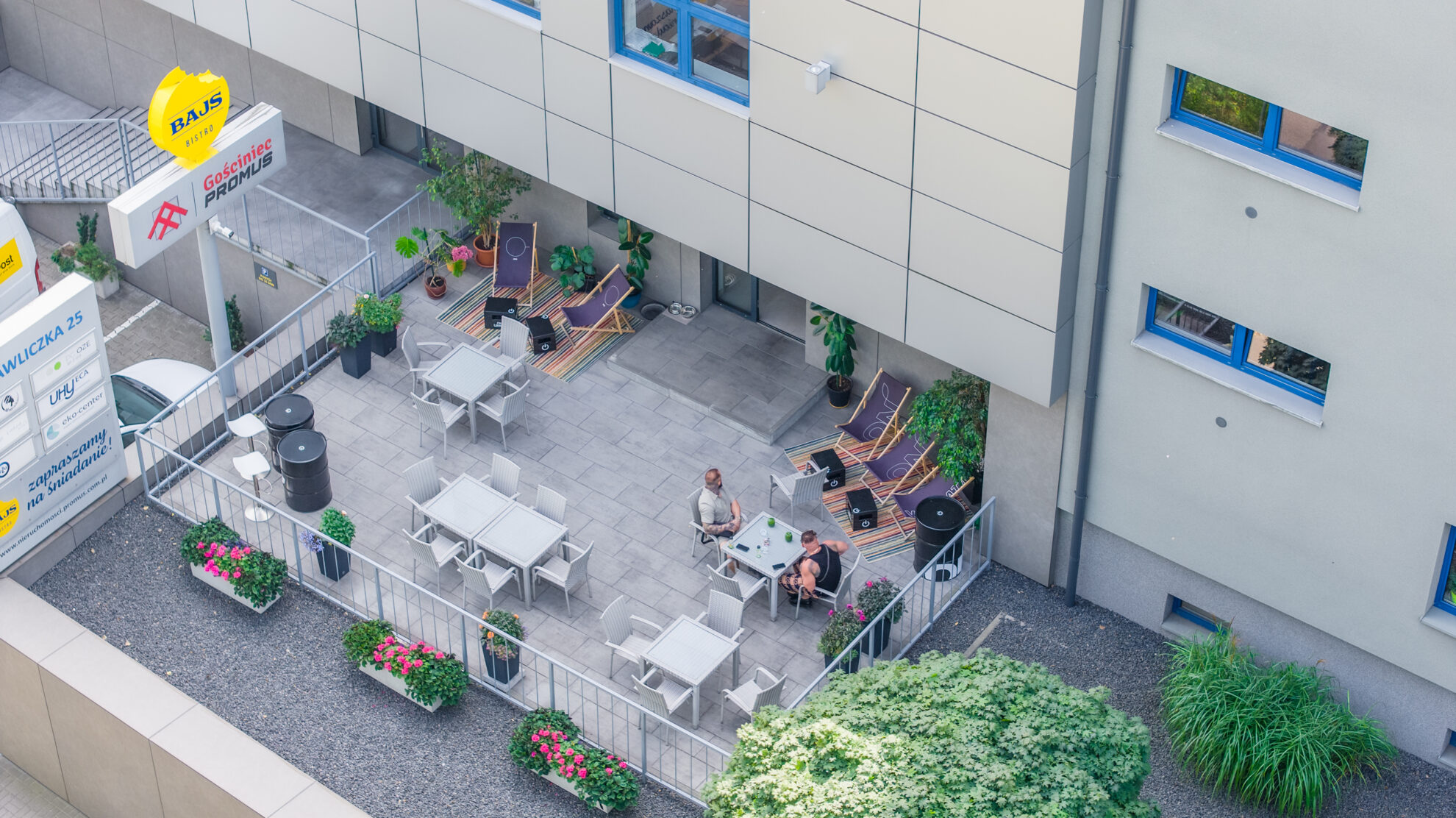 Możesz zjeść śniadanie na miejscu, w komfortowej przestrzeni, oglądając wiadomości lub pracując – na gości czeka szybkie Wi-Fi oraz wygodna sala idealna na spotkania biznesowe. W cieplejsze dni zapraszamy także na śniadanie na tarasie.